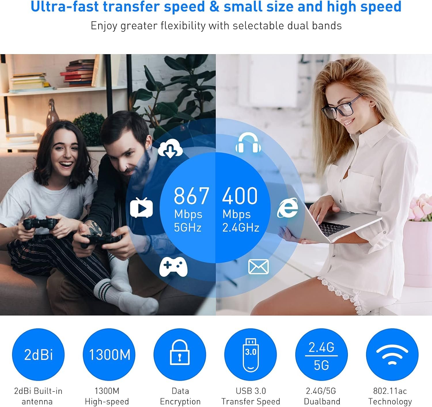 Adaptateur WiFi haute vitesse double bande 1300Mbps
