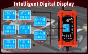 -Affichage Numérique Intelligent et Plug & Play: Nos chargeur de batterie intelligent sont équipés d’un écran LCD intelligent, qui peut afficher divers états de charge, tels que la tension de charge, le courant de charge, la température interne, la batterie pleine et bien d’autres états. Le chargeur de batterie moto est très facile à utiliser, il suffit de le brancher et de le faire fonctionner, vous pouvez remplir la batterie vous-même à la maison