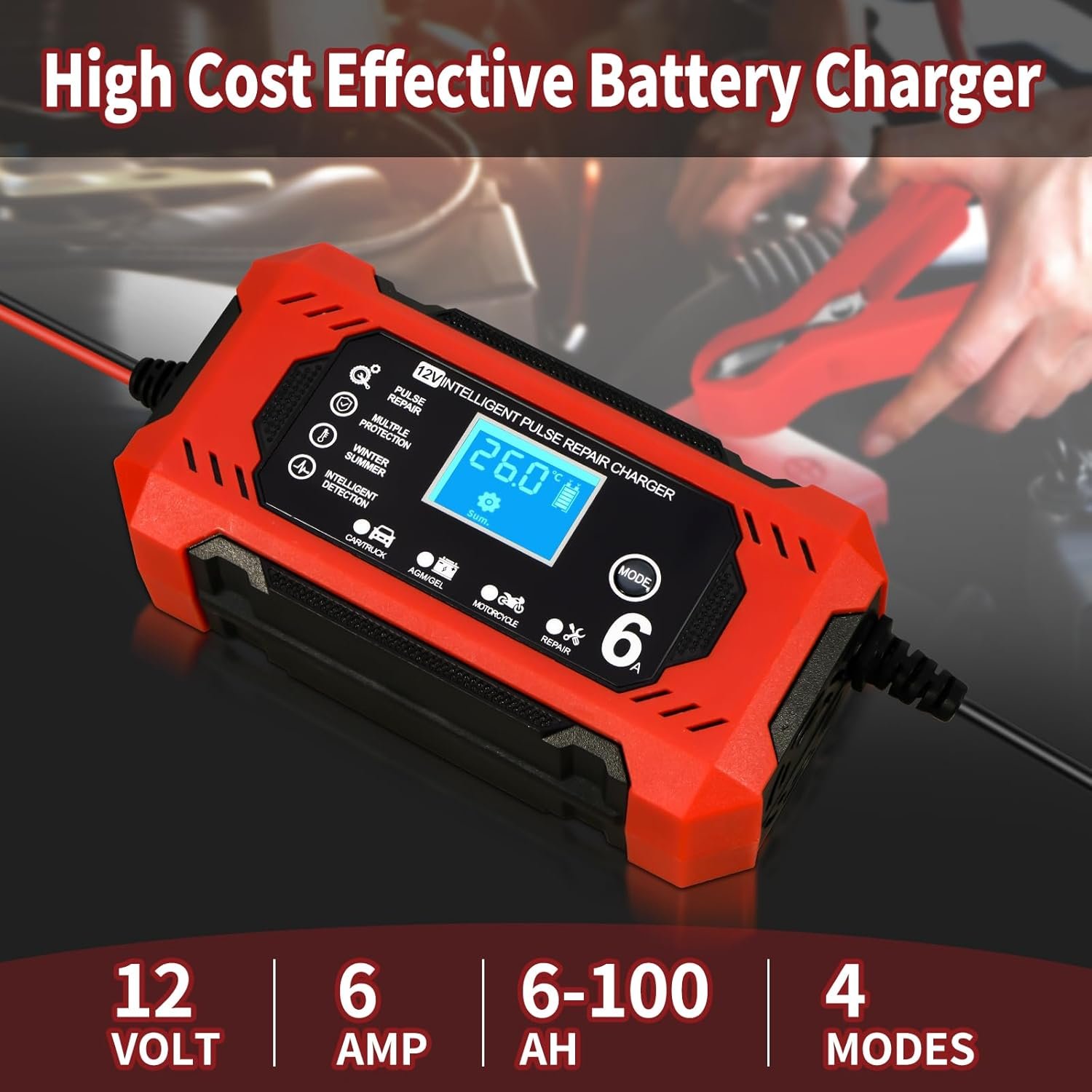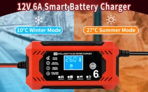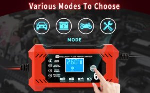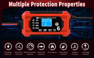 -Reconditionnement par Impulsions Très Efficace: Le chargeur batterie voitures 12v est doté d’une fonction de reconditionnement par impulsions qui détecte la sulfatation de la batterie et la stratification acide et rétablit la charge perdue. Ce produit prolonge la durée de vie de la batterie et renforce le démarrage du moteur.