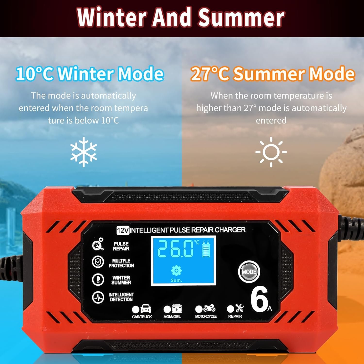-Protection de Sécurité Multiple: Le maintien de charge batterie voiture dispose de huit fonctions de protection: protection contre la surcharge, protection contre température, protection contre surtension, protection contre l’inversion de connexion, protection contre surpuissance, protection contre les courts-circuits, protection contre les surintensités, protection contre surdécharge, etc. Chargeur moto batterie est capable de résout les problèmes de charge dans les climats chauds et froids